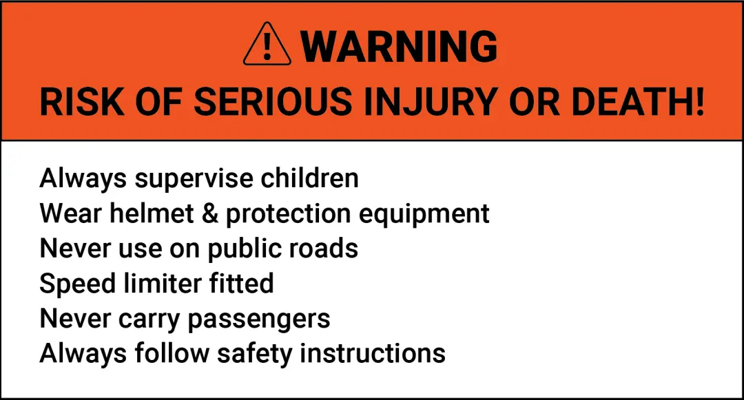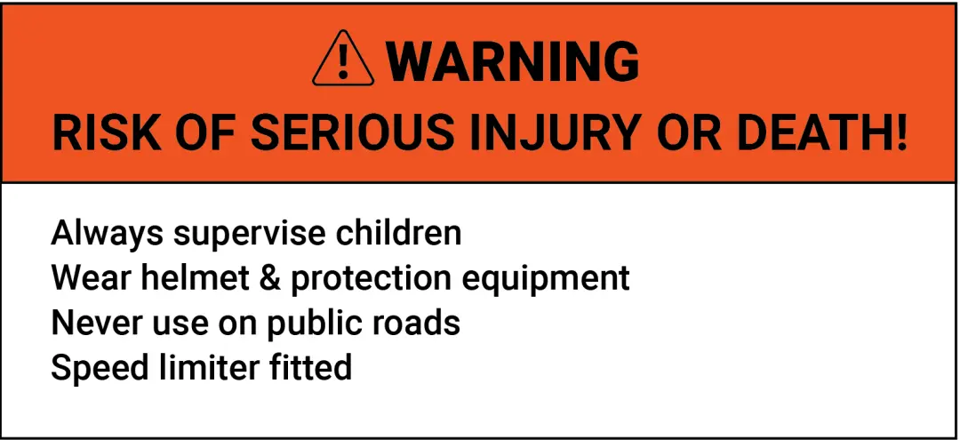 The following safety warning labels must be permanently affixed to the mini motorcycle (the diagrams below can be adjusted proportionally):