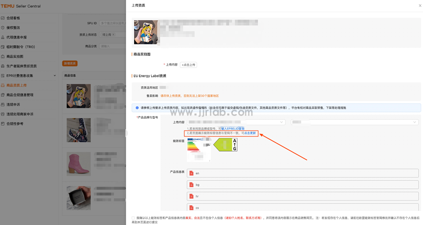 ② If the upload fails, it will prompt “The physical product image is missing the required energy label, please update and upload again”. You need to re-photograph the product or product packaging with the energy efficiency label and then submit the image.